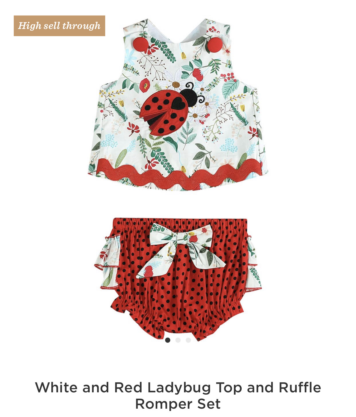 Made in pretty flower print and features an adorable lady bug, ruffle bottom and has a great cross over back